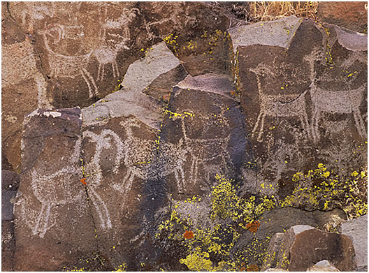 The desert mountains of California hold many fascinating archaeological secrets, and the Coso Range in particular has some of the world’s most extensive petroglyphs. The ancient images make us wonder way beyond our norms of time and place, and make us ponder what the stones and the voices of the ancient peoples could say if they could speak. Andy saw this collection of bighorn images in the morning, and was immediately struck by the way the symbols, facets, and lichens created a layered mosaic of form and time. He came back to photograph it in the afternoon, when even light let each part of the image play a balanced role.